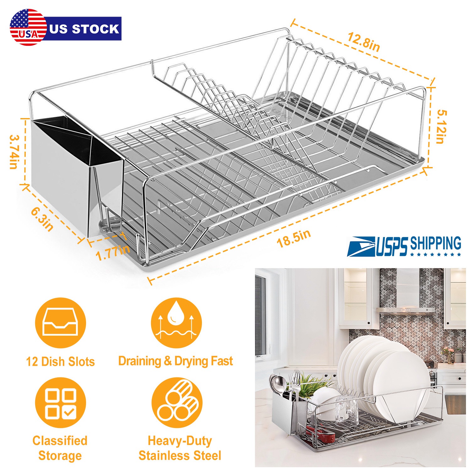 Our dish rack adopting high-grade stainless steel materials and premium electroplating finish is sturdy, durable, not easy to rust and gorgeous to match with all types of kitchen rooms. It can not only store your dishes, cups and bowls in order but also can accelerate air circulation and dry the tableware quickly to avoid the breeding of bacteria with its wholly hollow-out design. Additionally, it specially comes with a detachable cutlery holder which has three compartments inside and overspreads drain holes at the bottom to store the cutleries and a drain board to collect dishwater and allow the dish rack stands in place without sliding.